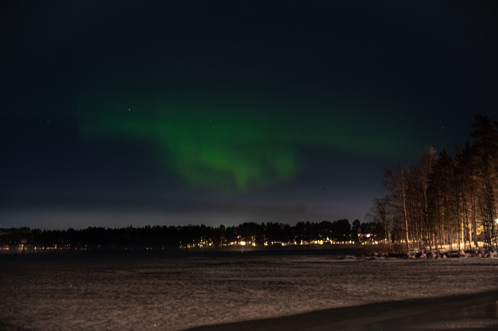 Am Abend sind wir dann zum ersten Mal zur Suche nach Nordlichtern aufgebrochen. Unsere Apps haben schwache Lichter vorausgesagt und weil die Stadt selber sehr viel Streulicht produziert, sieht man auf den Fotos mehr als von blossem Auge. Wir hoffen auf mehr Sonnenaktivität in den nächsten Tagen und vor allem auf klares Wetter.
