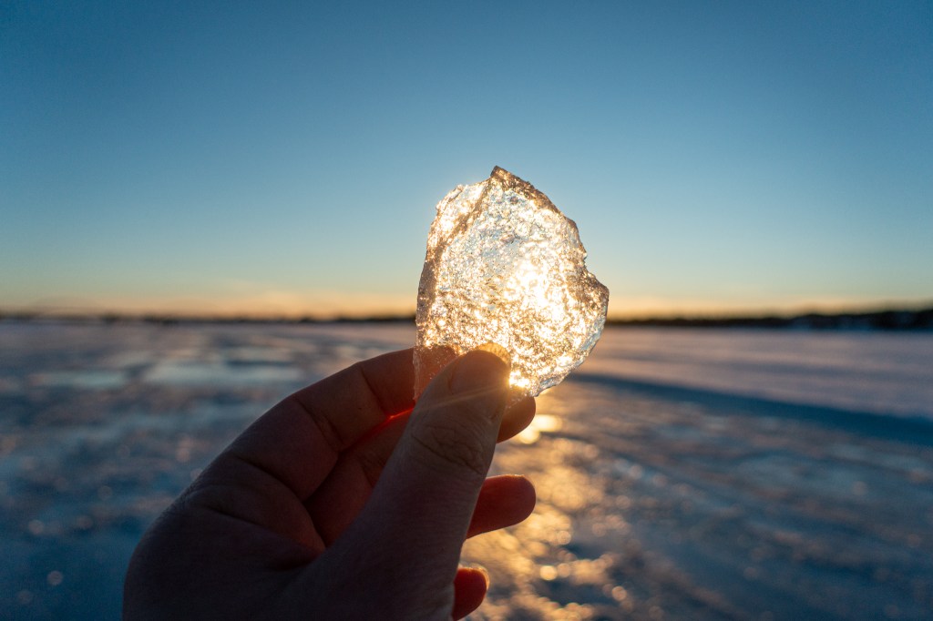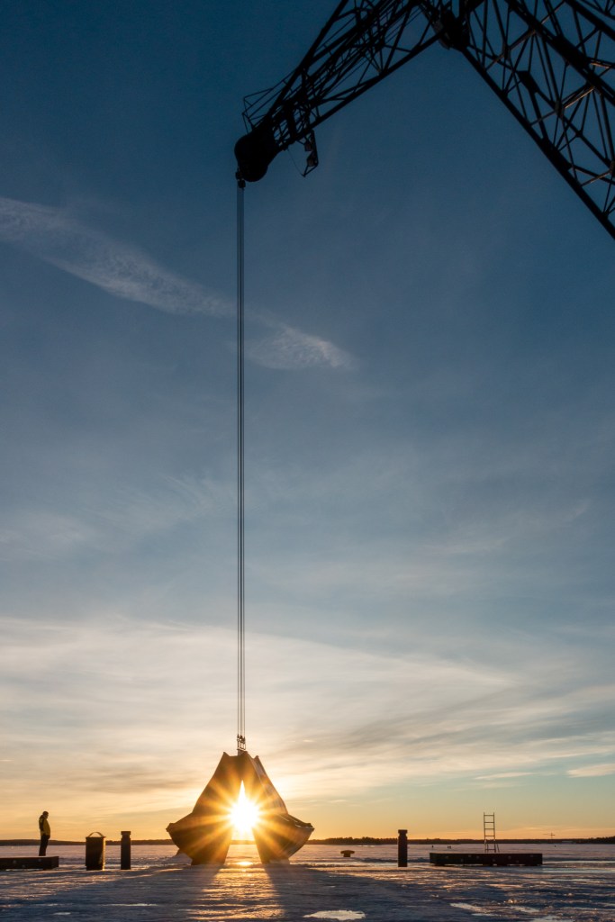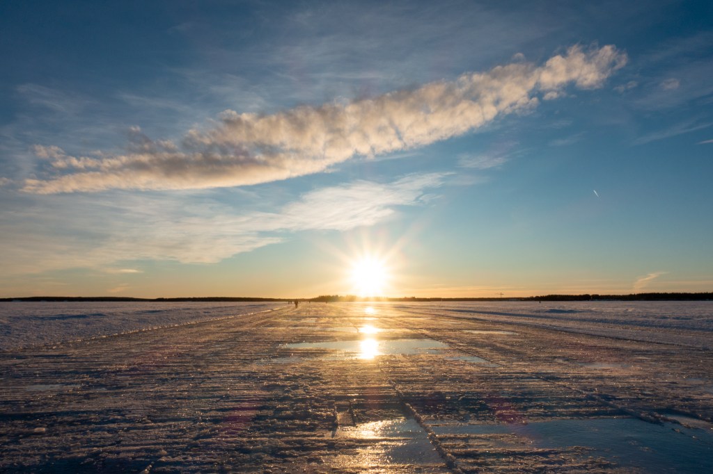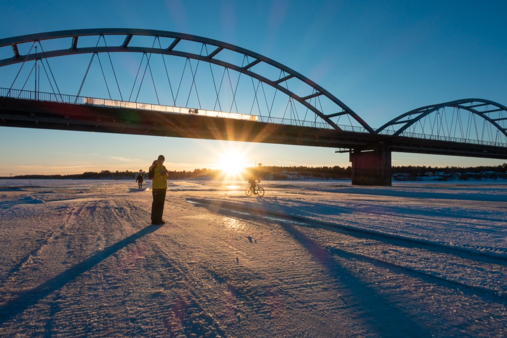 Nachdem wir die Sonne während sechs Tagen nicht gesehen haben, genossen wir sie heute umso mehr. Wir wagten uns auf den Eisweg aber erst, nachdem wir im Outdoorladen Spikes für unsere Schuhe gekauft hatten. Diese Investition hat sich gelohnt, denn damit sind wir sicher und ohne Rutschen über die noch nicht glatt gefräste rund 30 cm dicke Eisdecke des Luleälven marschiert. Einige wagen sich sogar mit dem Velo auf das Eis. Die Stadt plant, die Eiswege in den nächsten Tagen fertig zu präparieren, damit sie dann auch für Schlittschuhläufer zugänglich sind.