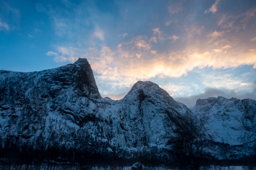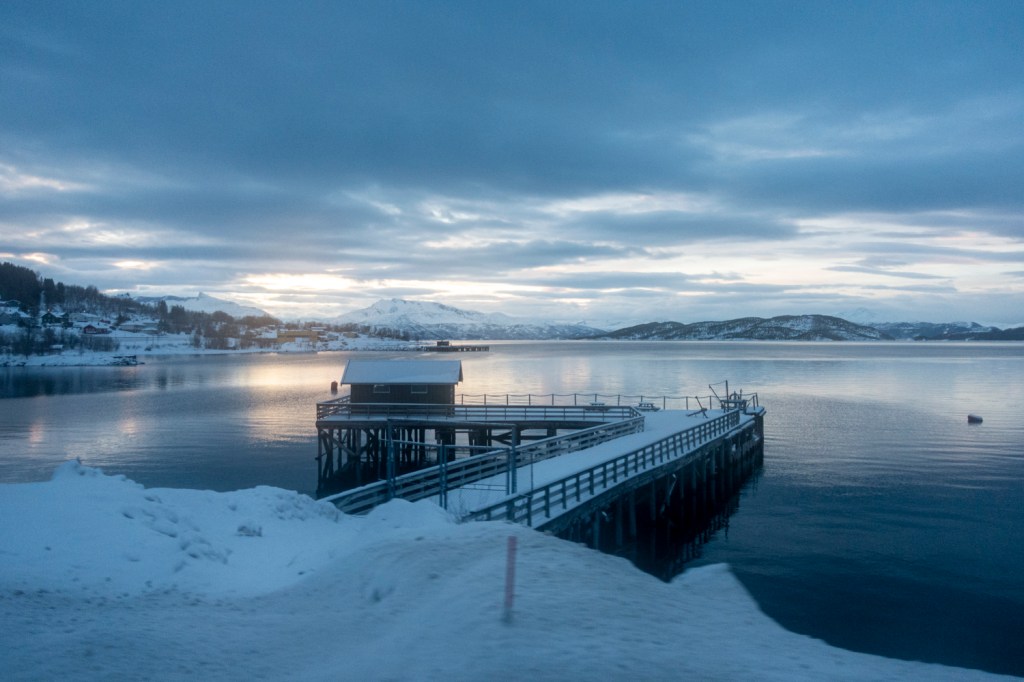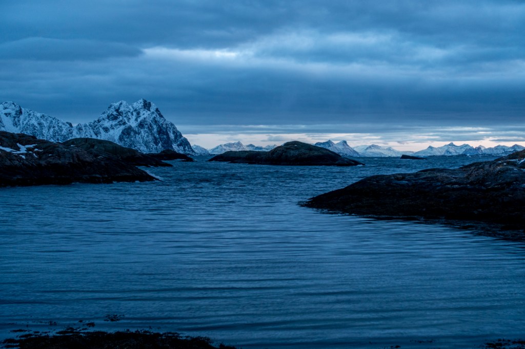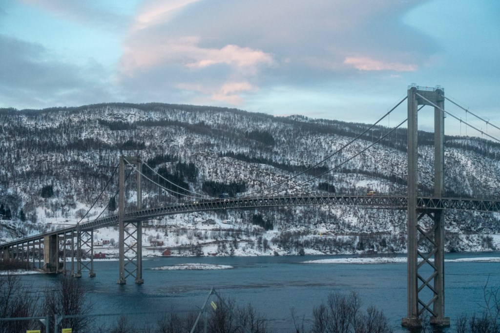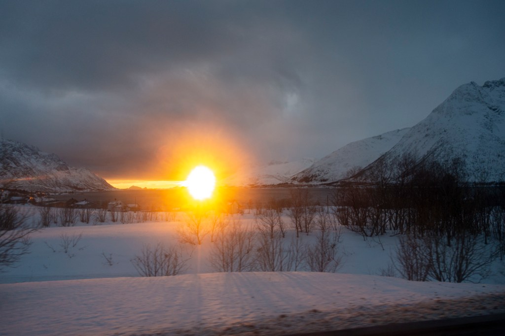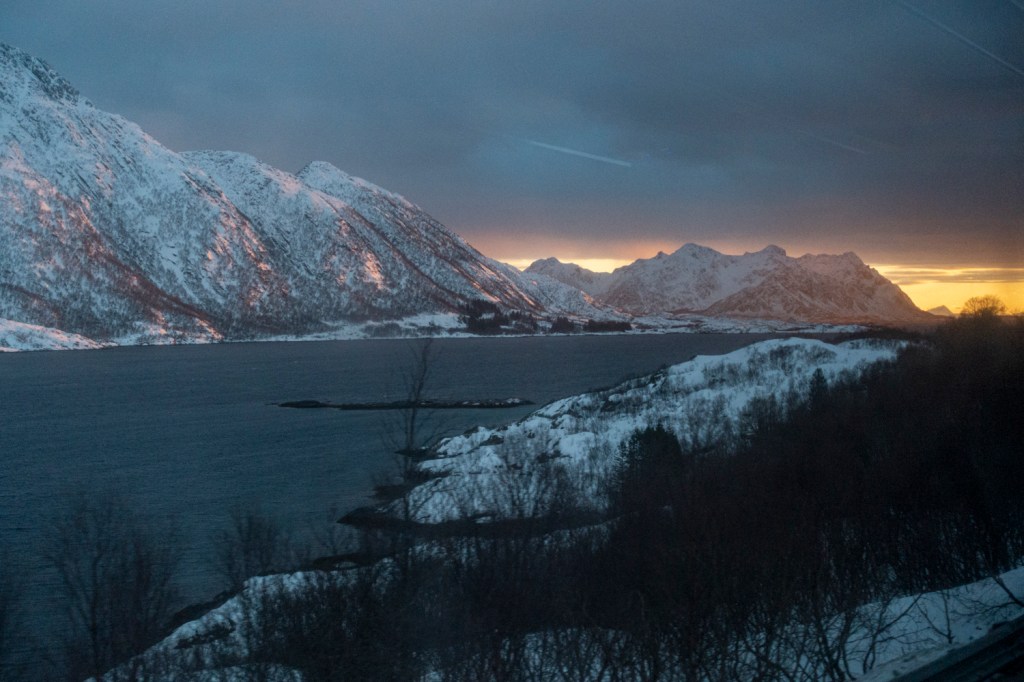 Es gibt täglich zwei Verbindungen vom Festland nach Svolvær und die Fahrt führte durch die oft einsame norwegische Landschaft vorbei an Höfen und kleinen Ortschaften, über viele Brücken, durch Tunnels und entlang von Fjorden und Sunden. Das Wetter bot eine eindrückliche Szenerie mit Wolken und der tiefstehenden Sonne. Entspannt genossen wir die Aussicht aus unseren Bussitzen.