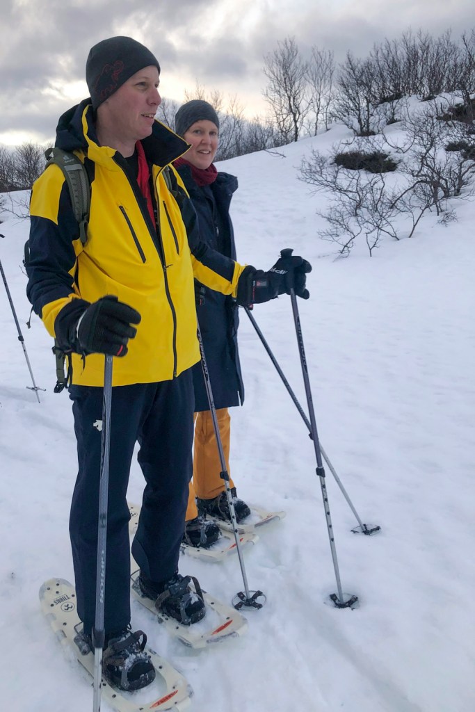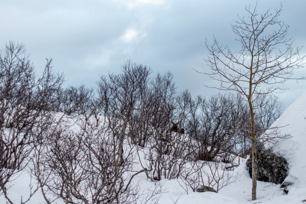Mit ‚chr, chr, chr, chr‘ ist das Geräusch gemeint, wenn man mit Schneeschuhen über Schnee läuft, welcher an der Oberfläche gefroren ist. Wir haben mit Odd (der heisst wirklich so!) und 3 Franzosen zusammen eine Schneeschuhtour unternommen – Odd hat uns mit einigen technisch etwas anspruchsvollen Passagen herausgefordert, uns viele Geschichten und Sagen aus der Gegend erzählt (bei Tageslicht versteinerte Trolle und so) und uns verschiedene Tierspuren gezeigt. Es hatte viele Elchspuren und -scheisshaufen und wir haben wieder einen Elch gesehen. Er versteckt sich auf einem der Bilder.