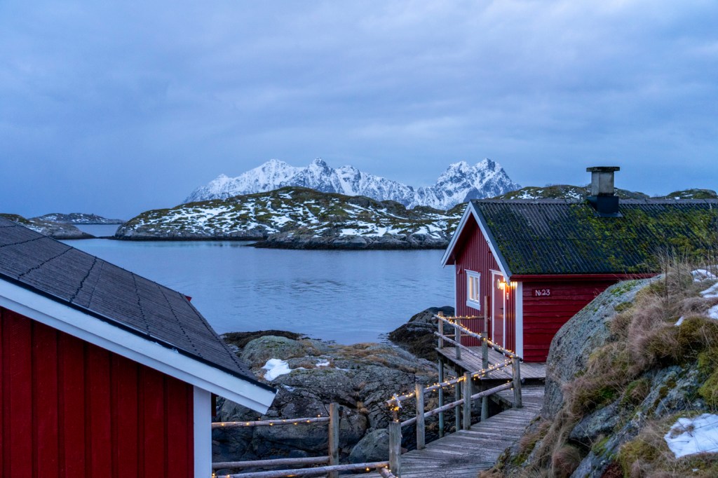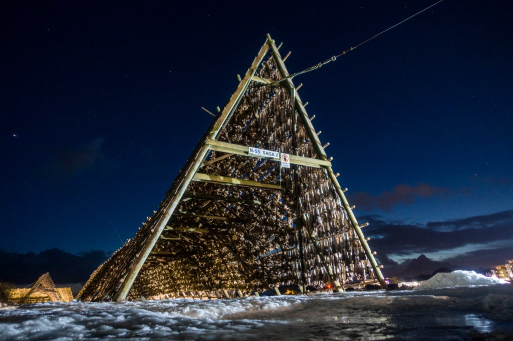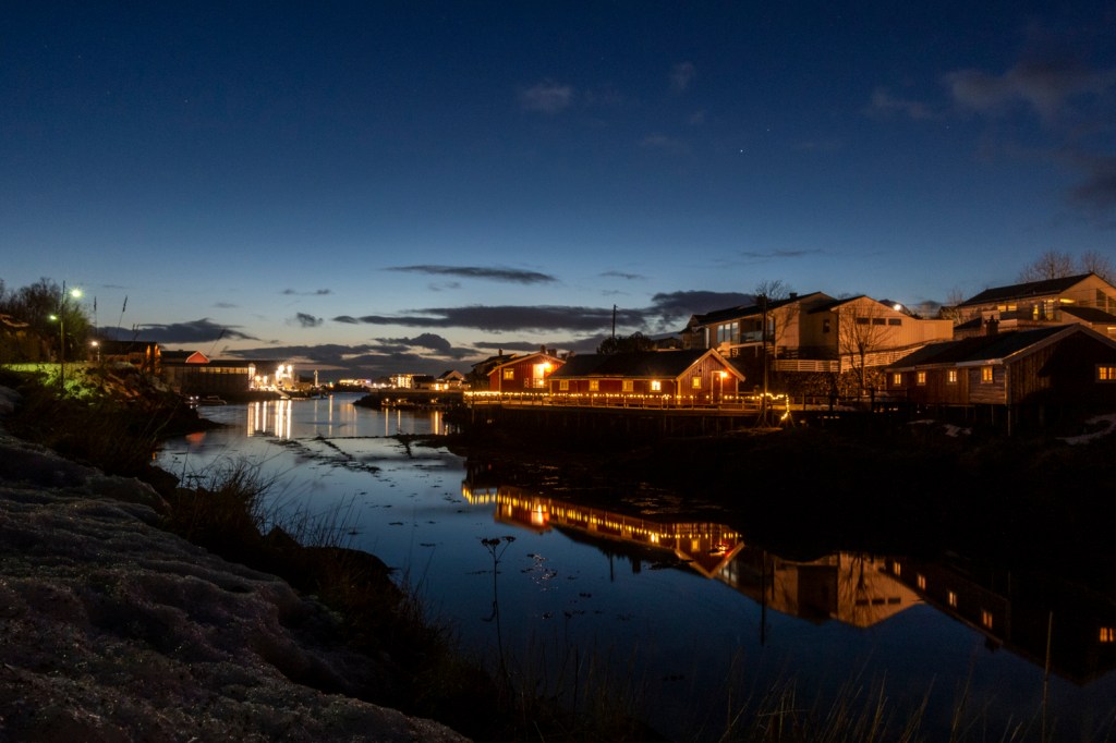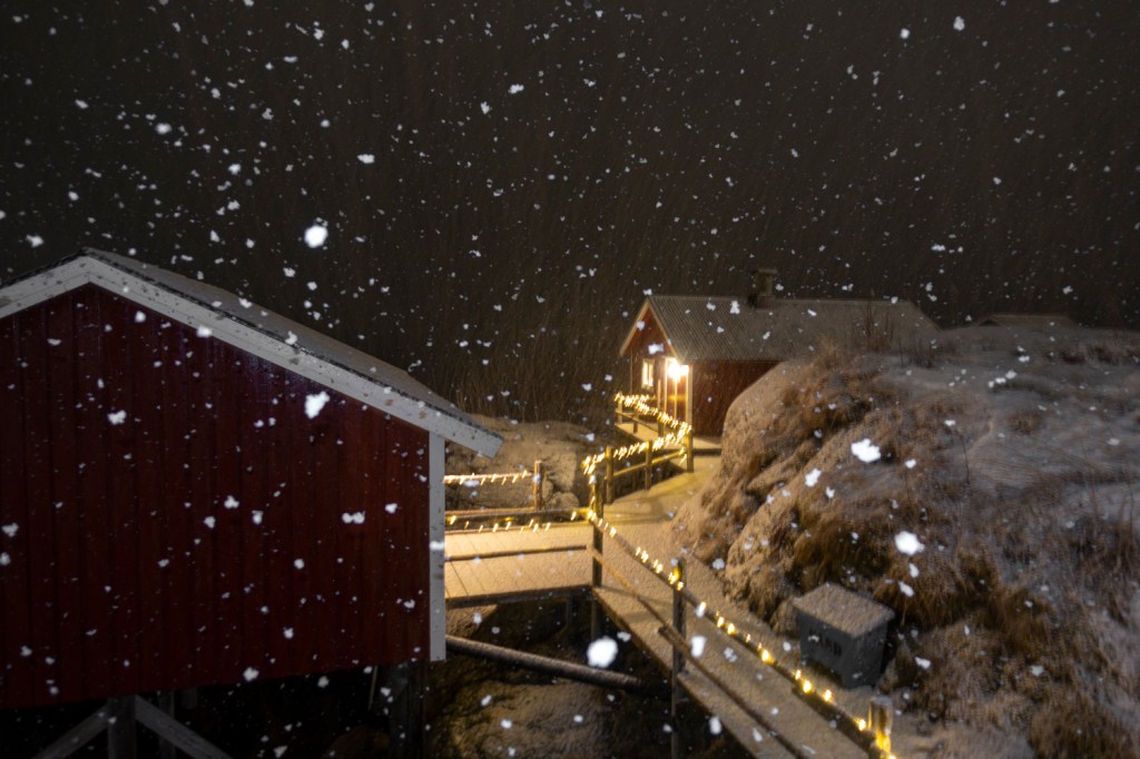 Nach der Rückkehr zum Rorbu haben wir unsere Insel erkundet und sind vorbei an einer Fischernetzfirma und den ersten aufgehängten Stockfischen (stinkig und bei Nacht etwas unheimlich, Spezialgruss an MaHa, der mir diesen Gestank gewünscht hat) bis auf die Mole rausgegangen, wo wir sogar ein schwaches Nordlicht gesehen haben. Gut eine Stunde später hat es so geschneit wie auf dem letzten Bild!
