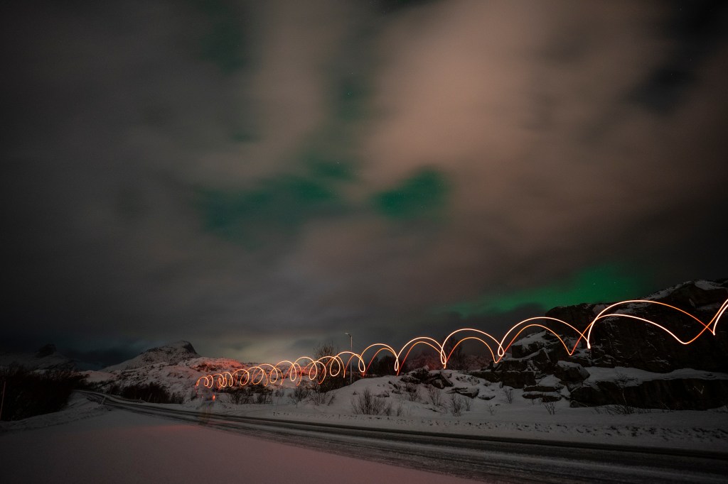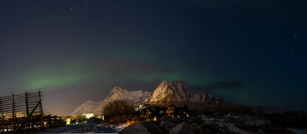 Relativ spät abends sind wir nochmals aus dem Haus, um um den nächsten Berg herum ins Dunkle zu fahren und Nordlichter zu suchen. ‚Grüne Suppe‘ gab es, keine schönen Nordlichter, und auch diese nur hinter Wolken. Dafür bin ich etwas mit meinen Heizhandschuhen herumgeirrlichtert 😂 Man muss sich ja irgendwie warm halten.
