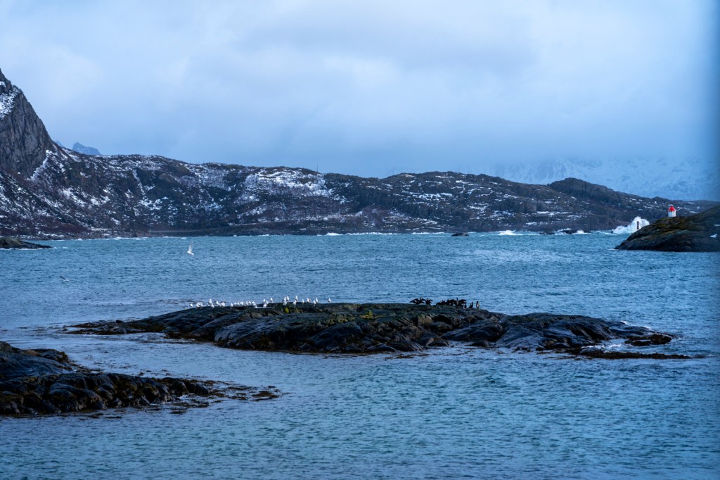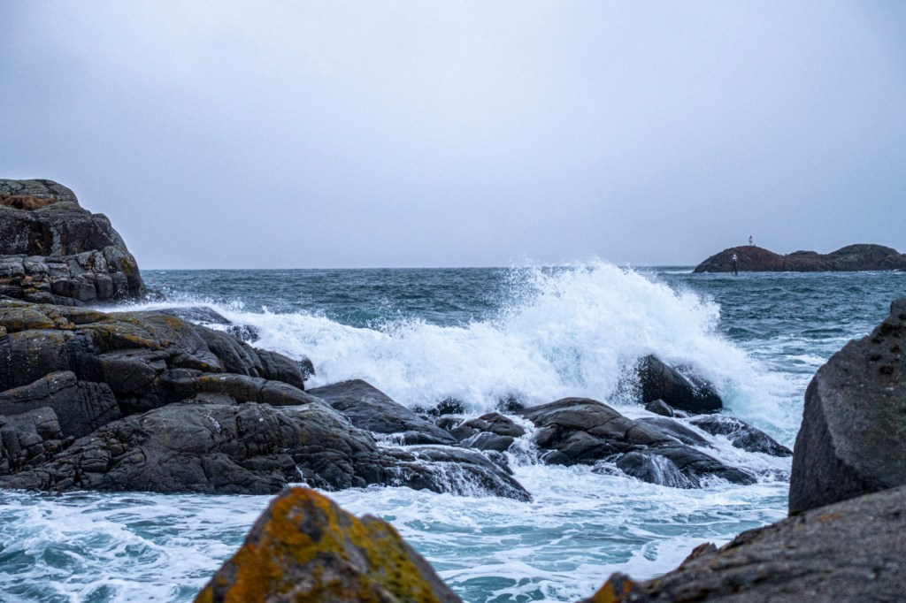 Der Wind wühlte das Meer auf und die Flut stieg fast bis zu unserem Schlafzimmer. Das Wetter zeigte sich heute von seiner garstigen Seite, doch von unseren Fenstern aus, welche einen Blick in alle vier Richtungen erlauben, lässt sich Vieles beobachten – Kormorane und Möwen, welche sich auf einem Felsen versammeln oder Wellen, welche grosse Brandungsfontänen produzieren. Wir haben es heute gemütlich genommen und Anja hat begonnen, Handschuhe zu stricken.