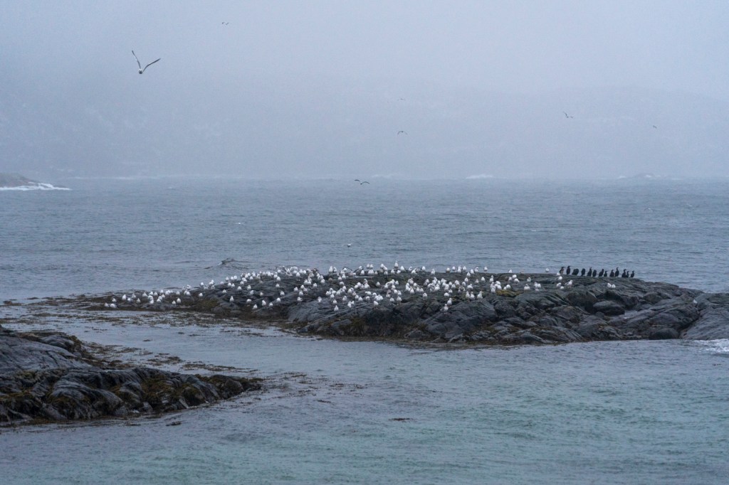 Damit müssen Reisende auf den Lofoten in jeder Jahreszeit rechnen – Regen ohne Pause von morgens bis abends. Wenn man nur einen kurzen Aufenthalt geplant hat, wäre das natürlich ein „verlorener“ Tag. Für uns aber war es eine gute Gelegenheit, die Batterien beim „zu Hause sein“ aufzuladen. Stricken, Lesen und Vögel beobachten waren unsere Aktivitäten heute. Immerhin haben wir es noch ins Dorfzentrum geschafft, um ein Geburtstagsgeschenk einzukaufen und einen Kaffee zu trinken. Wir geben es zu, wir nahmen dazu das Auto und wurden schon nur auf den Wegen zwischen Parkplatz und Geschäften ordentlich nass.