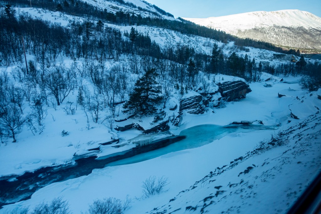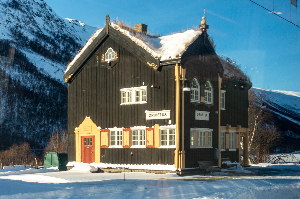 Unterwegs haben wir neben viel Schnee und Bergen und hübschen, in folkloristischem Stil erbauten Stationshäuschen vier Elche und jede Menge Elch- und andere Tierspuren im Schnee gesehen. Die Tiere stehen also nicht nur dann herum, wenn ein Tourguide mit einer Gruppe vorbei kommt!